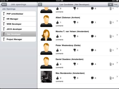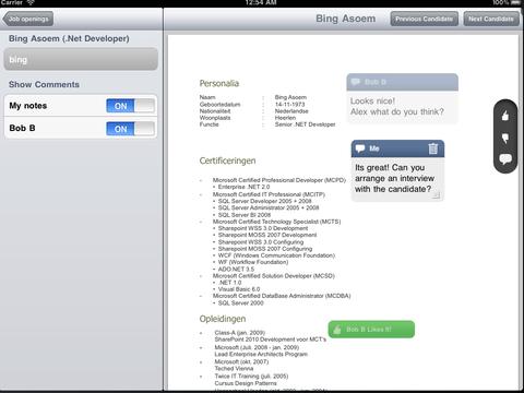 Cureka! automatically loads CVs onto the iPad. The CVs can then be screened using yellow digital memos and ‘thumbs up’ or ‘thumbs down’ which can be inserted randomly in the text. This is familiar to users from social networking sites. The screening of CVs becomes a more comfortable process.  Moreover, during a job interview notes and photos can be read into the e-recruitment system immediately. This way static documents on a central database become more ‘social’ and are easier to classify. The CV contains more relevant information and it will be easier to make the right match on any given moment.